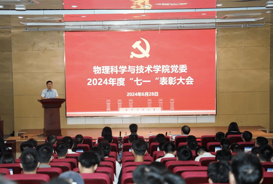 党委在理学院报告厅召开庆祝中国共产党成立103周年暨2024年度“七一”表彰大会。学院领导班子成员、党委委员、各党支部书记、学院师生党员参加会议。会议由学院党委副书记樊文迪主持。