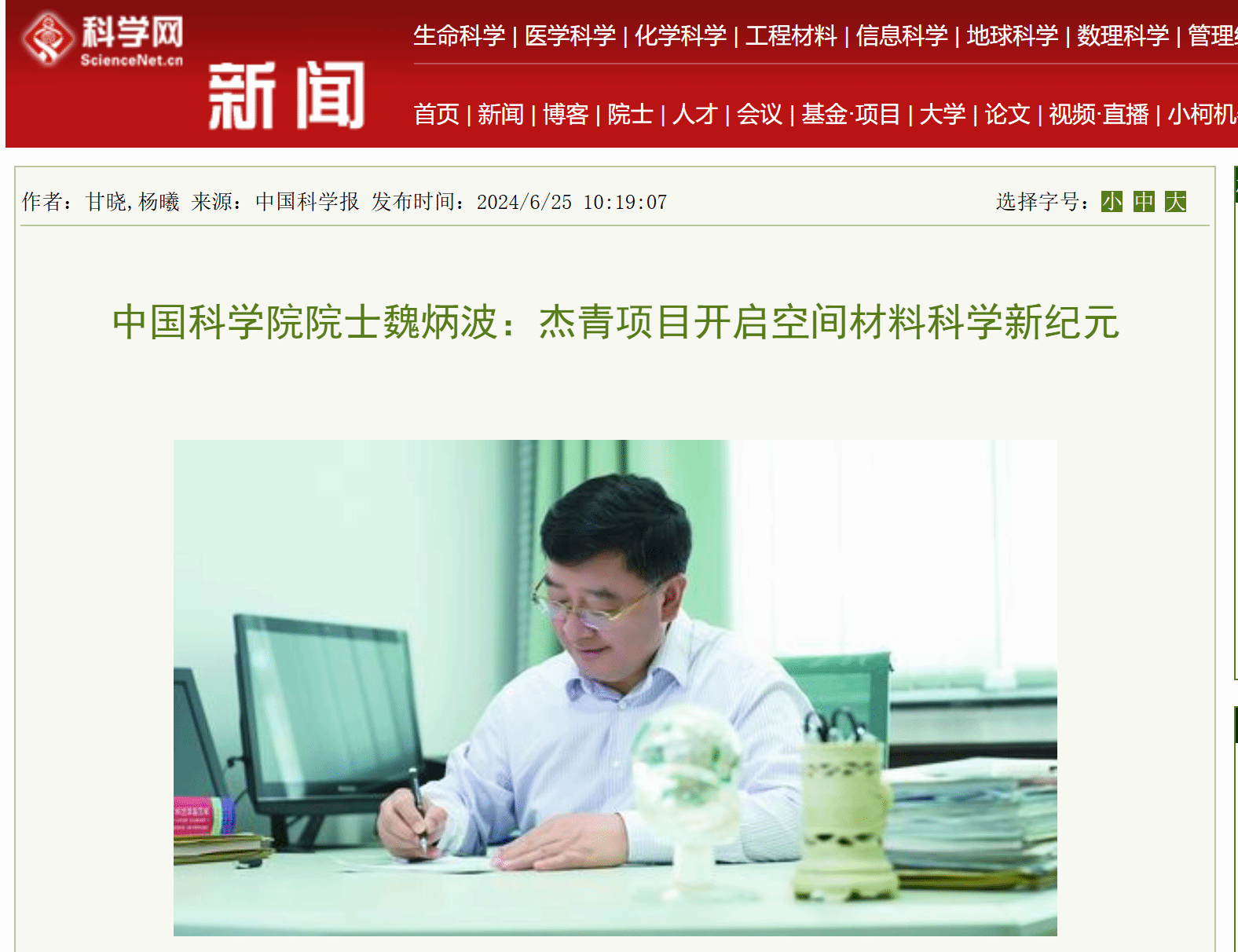 6月25日,科学网发布了专题报道“中国科学院院士魏炳波:杰青项目开启空间材料科学新纪元”。