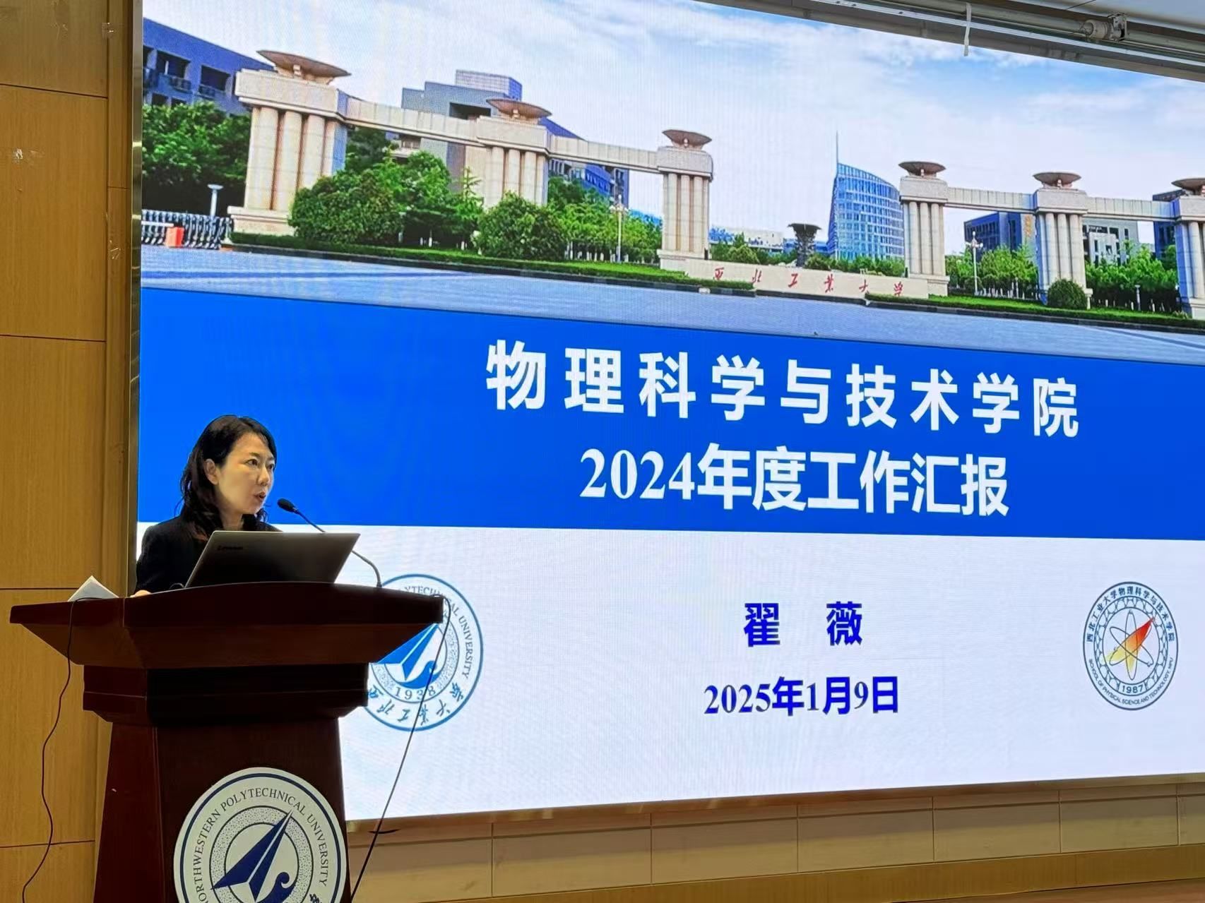会上,翟薇院长首先做了学院2024年度工作汇报。翟薇院长从学科建设、人才培养、科学研究、队伍建设等四个方面详细讲解了学院目标责任制完成情况,并对学院2025年重点工作目标进行了详细的阐述。她指出,在新的一年全院教职工要继续锚定学校“127”发展目标,以更高的标准、更务实的作风、更有力的措施推动各项任务落实落地,加快建设一流物理学院。