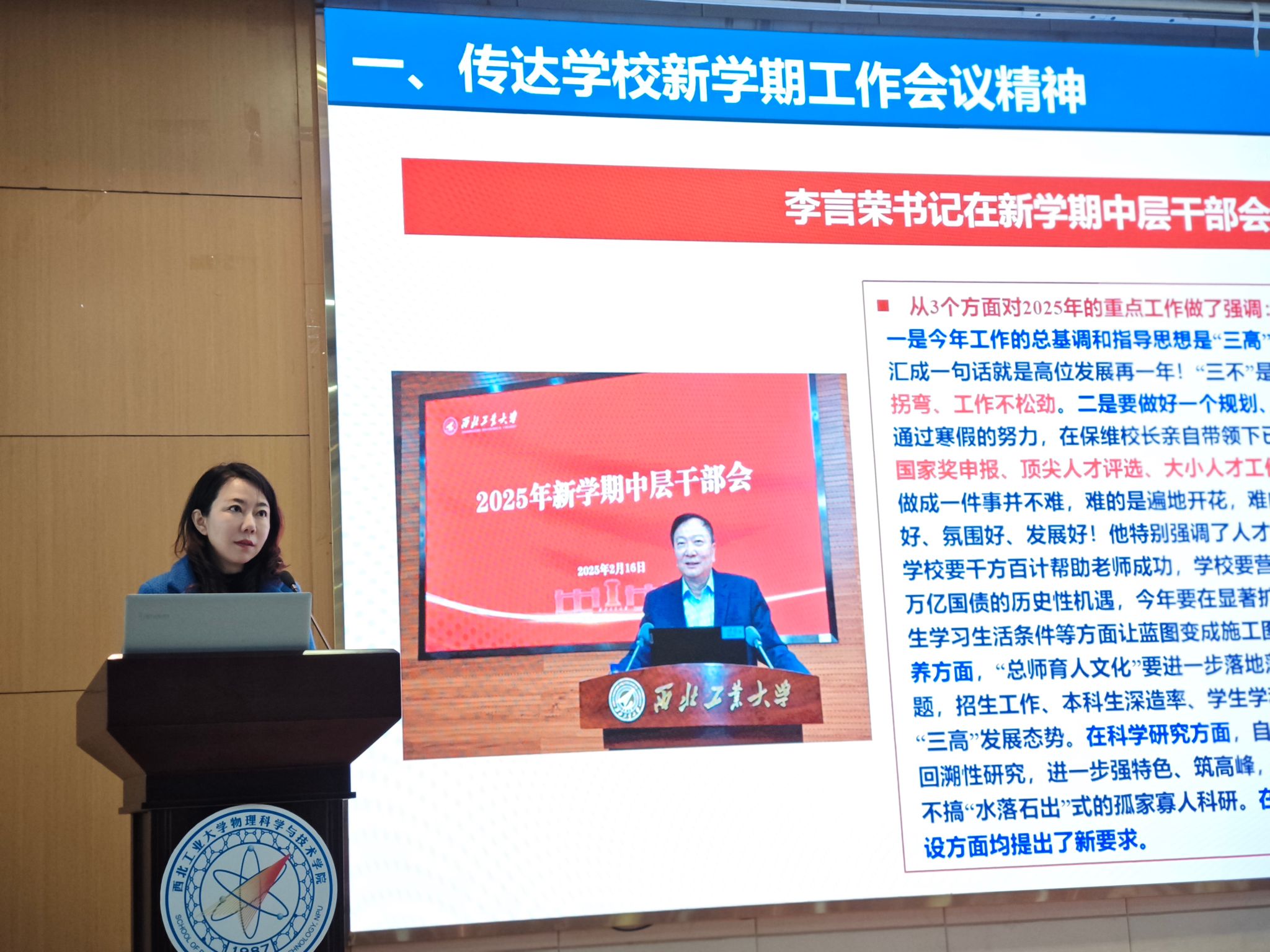 翟薇院长首先向全体教职工传达了李言荣书记、宋保维校长在寒假务虚会、新学期干部会上的报告精神。李言荣书记强调2025年学校要以“高质量、高水平、高速度”为工作的指导思想和发展思路,以抓核心竞争力为主要手段,走内涵式发展路径,并积极应对人工智能对人才培养、科学研究模式的严重冲击。宋保维校长的报告系统回顾了“十四五”以来学校在人才培养、队伍建设、科技创新等领域取得的各项工作成效,深入剖析发展中的问题和突破口,为“十五五”战略规划谋篇布局。