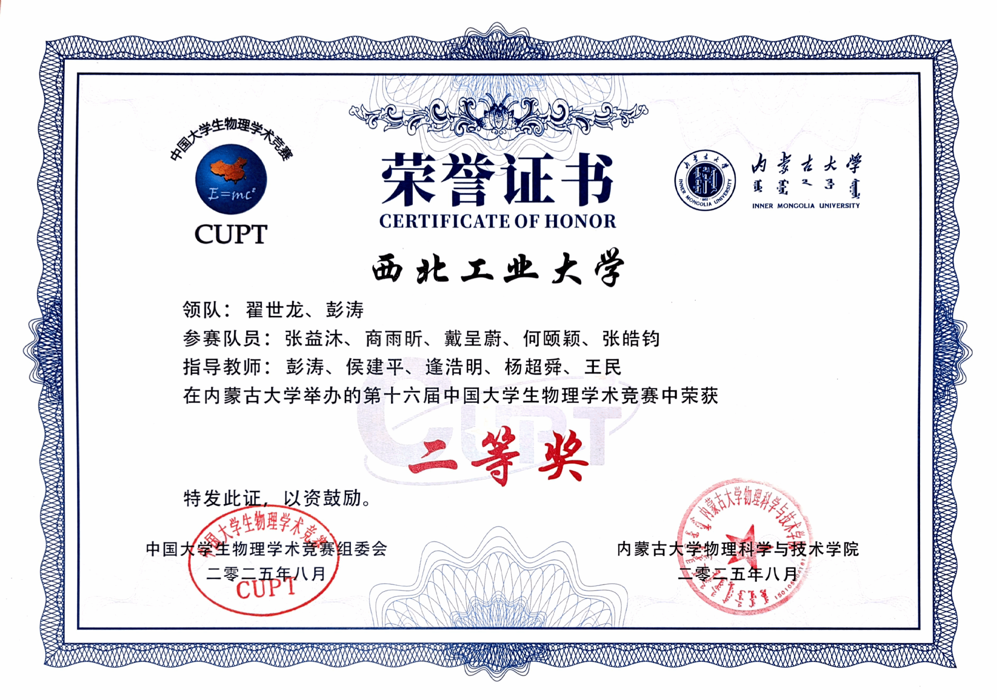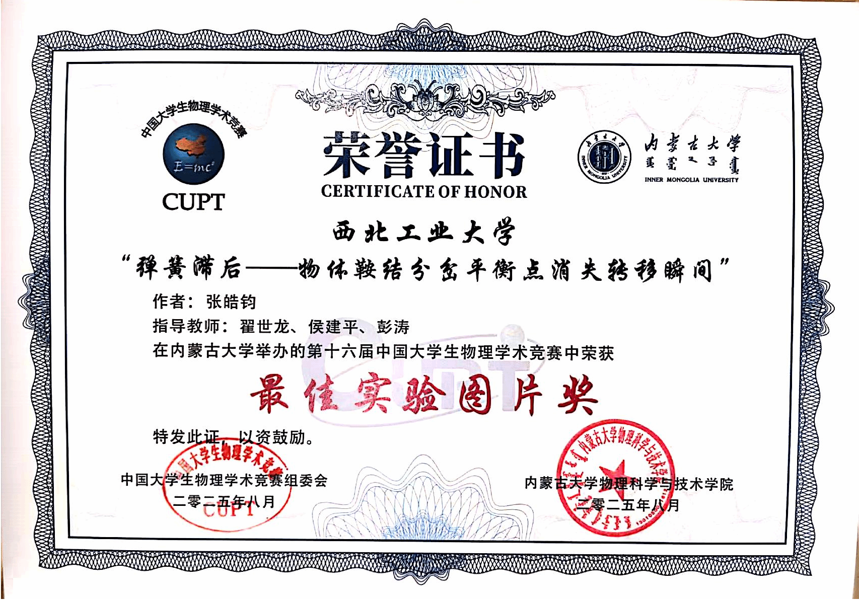 代表队由23级本科生张益沐(队长)、张皓钧、商雨昕,24级本科生戴呈蔚、何颐颖五位同学出战,翟世龙、彭涛、侯建平、逄浩明、杨超舜、王民等教师组成指导团队。团队在物理学科竞赛创新实践基地中进行了12个月的不断打磨、数十次地集中备赛,而后经历了校赛、省赛和西北赛的多轮拼杀,最终凭借扎实的理论功底、创新的实验方案与出色的临场应变能力,赢得国赛专家评委一致好评。除团体二等奖外,bl动画