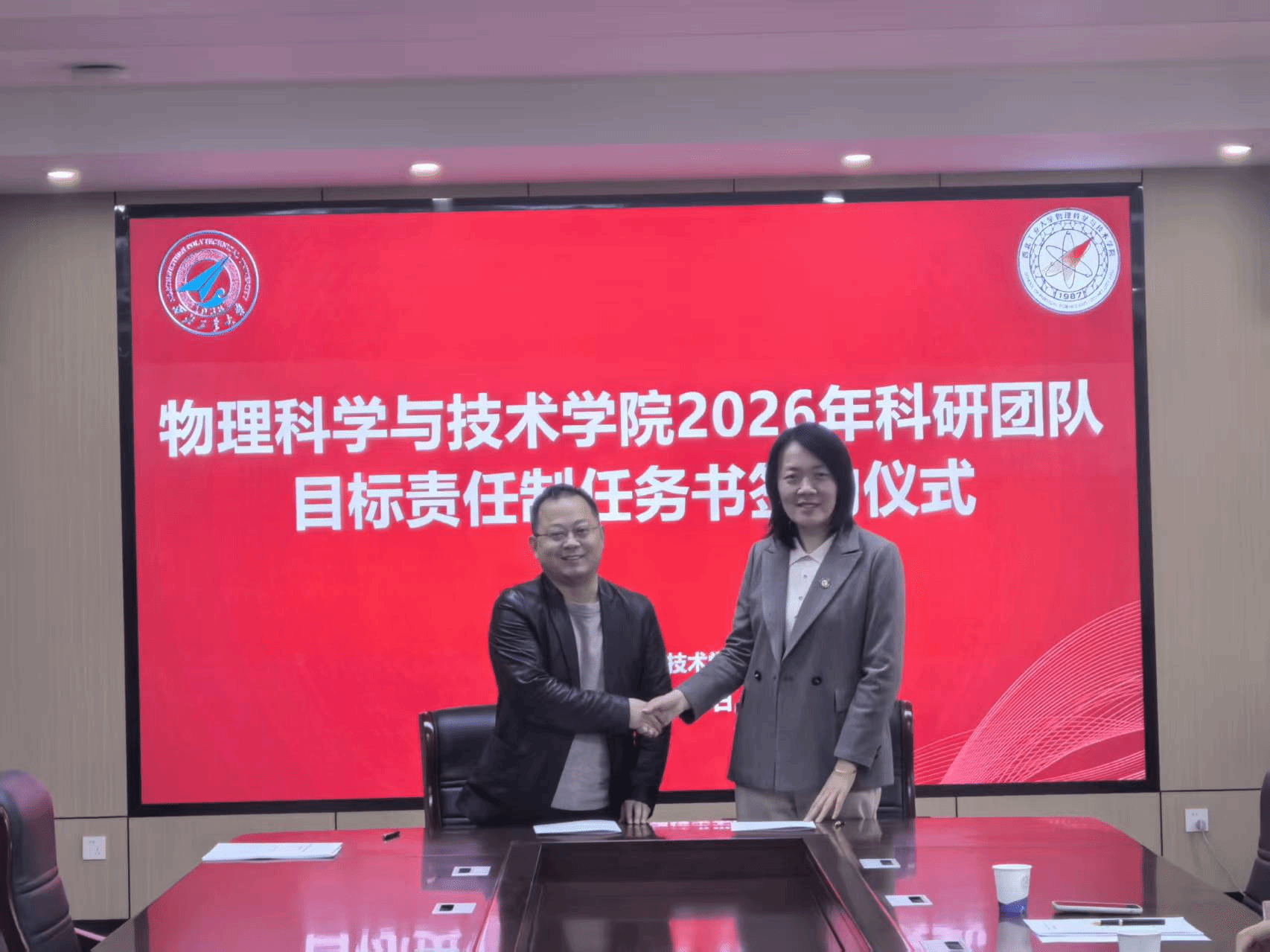 科研团队目标责任制管理办法》,对各个团队2026年度的科研和师资队伍建设任务指标进行解读,并代表学院分别与陕西省光信息技术团队、超声科学与技术团队和光基物质科学与超快过程团队负责人现场签订任务书。