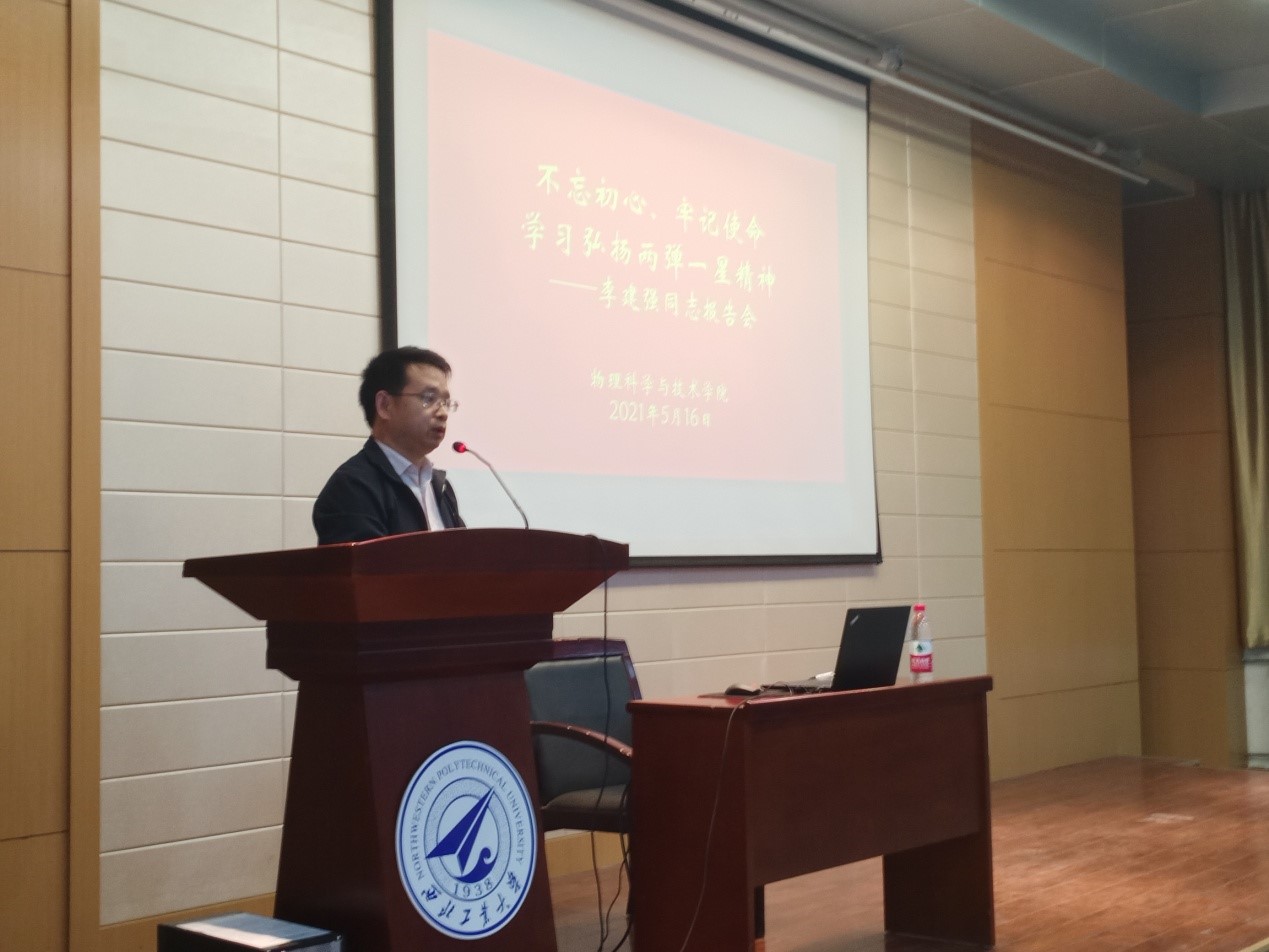 举办的“不忘初心、牢记使命——学习弘扬两弹一星精神”专题报告会在物理学院学术报告厅举行,中国工程物理研究院党校李建强副教授应邀做客我校作上述精彩报告。学院党委书记杨铭、党委副书记王洲航、院长助理肖鼎新以及全院师生200余人参加报告会,报告会由杨铭书记主持。