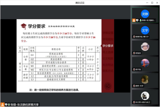 研究生新生入学工作组于8月29日举办了2022级研究生选课线上培训会,为同学们详细讲解了选课注意事项、各类型课程学分要求、培养过程关键节点要求等,会议由负责研究生培养工作的副院长尹剑波主持,研究生辅导员李玉泽老师,教学秘书等工作组成员参加了会议。