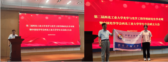 中国光学学会会士赵建林教授随后向同学们介绍了中国光学学会设立学生分会的意义,鼓励同学们通过学会和学生分会提供的平台,积极参加学术交流活动,相互学习、共同进步。随后,赵建林教授和学生分会主席毕辛仪共同向大家展示了中国光学学会授给我校学生分会的会旗。