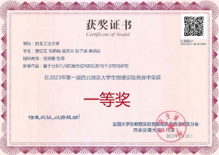 学生董钇辰队长和曹恩馨队长分别带领的2支队伍成功进入决赛,并在决赛中表现优异,分别获得了国家一等奖和二等奖。获奖作品分别为“命题类-基于分形几何的复杂结构的衍射与干涉特性研究”和“讲课类-迈克尔逊干涉仪测空气折射率”。在本次国赛中,我校共获得一等奖1项、二等奖1项、三等奖2项,由于竞赛成绩优异,我校同时获得优秀组织奖。