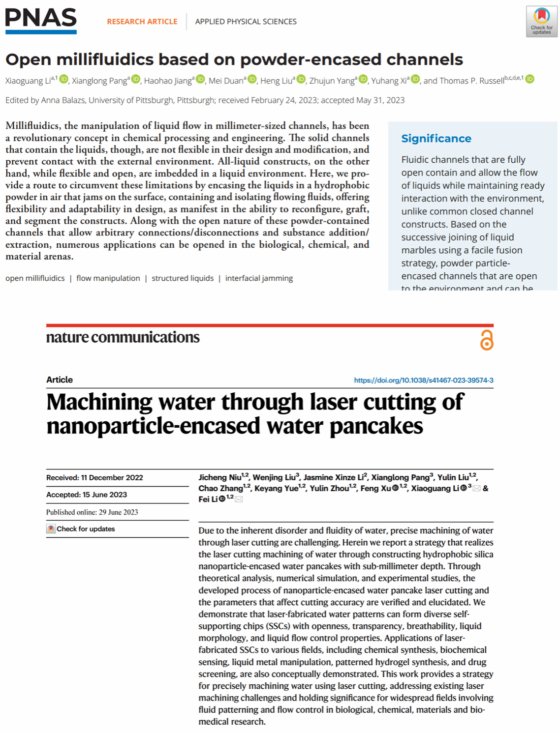 李晓光副教授为论文“Open millifluidics based on powder-encased channels”(PNAS)第一作者和通讯作者,劳伦兹伯克利国家实验室的Thomas Russell教授为共同通讯作者。李晓光副教授与西安交大生命学院李菲教授为论文“Machining water through laser cutting of nanoparticle-encased water pancakes”(NC)共同通讯作者。